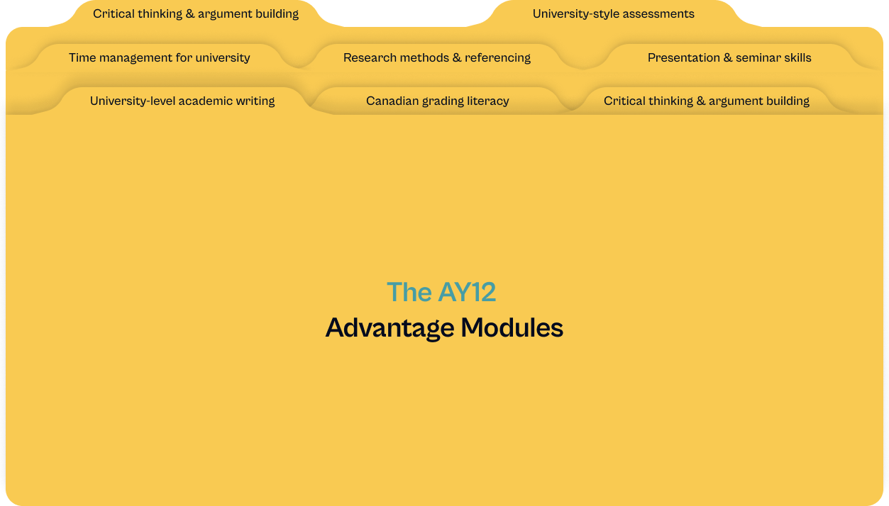 The Grade 12 Advantage Year (AY12) is our flagship academic experience. It is designed for the ambitious student who recognizes that getting into a Canadian university is only half the battle